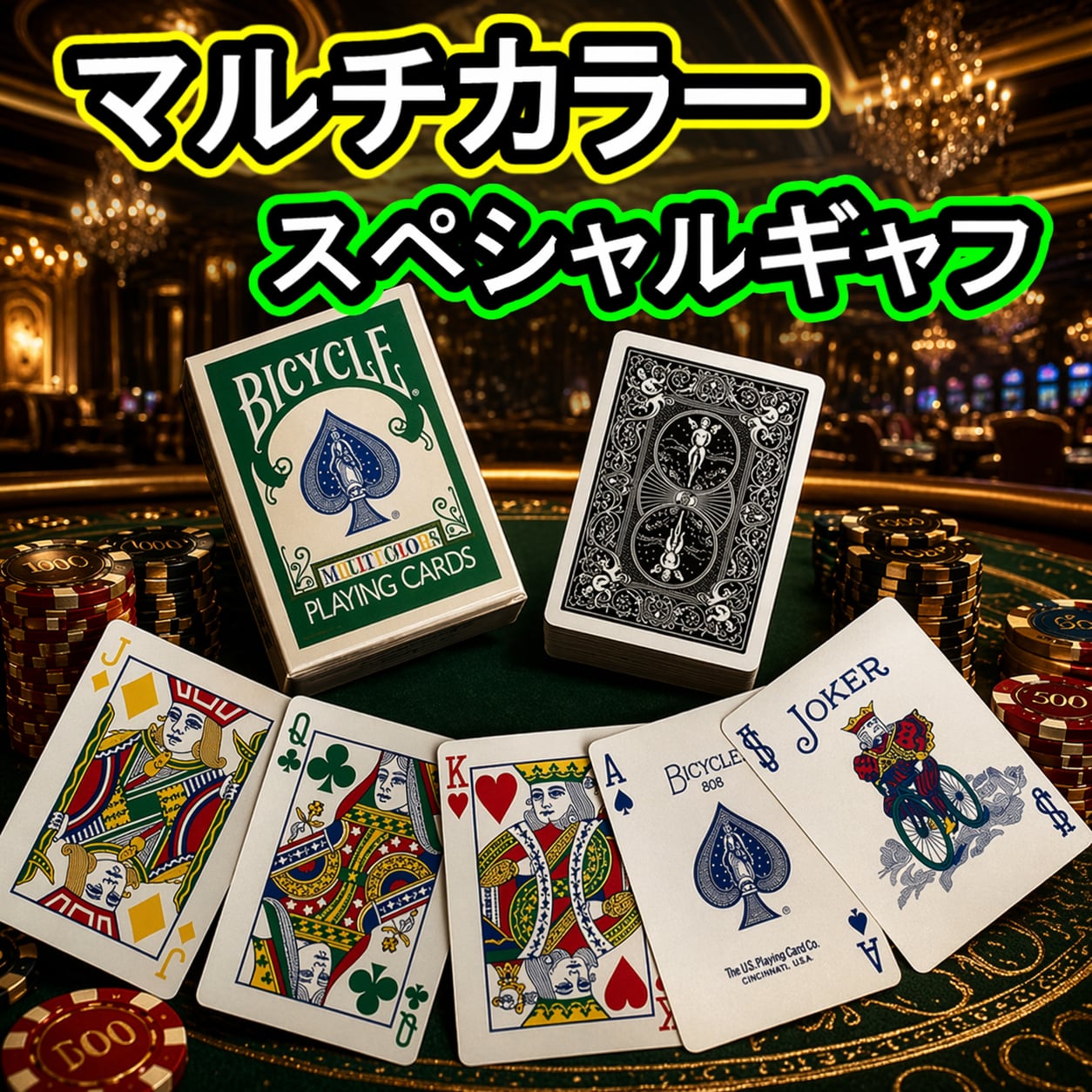 あなたのマジックショーを彩る、限定1個の【マルチカラー・スペシャルギャフ】バイシクルが登場しました!希少価値が高いオハイオ製で、特別な演出を加えることができるアイテムです。これがあれば、あなたのパフォーマンスが一段と引き立つこと間違いなしです!